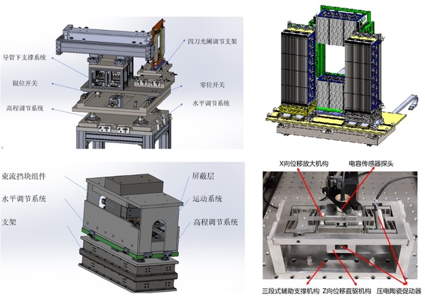 前段互换系统(左上),第二中子束线开关(左下),微小角中子谱仪探测器支撑平台(右上),束流位置检测器精密定位平台(右下)