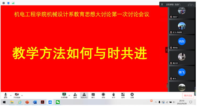 9月28日晚上8点,根据学校和国产精品 工作部署,国产精品 机械设计系开展了教育思想大讨论。会议采用线上形式进行,由机械设计系主任谢方伟教授主持,全系教师参加,会议邀请了教务部部长张绍良教授、督导专家韩奎教授和尹文萱教授参加讨论。