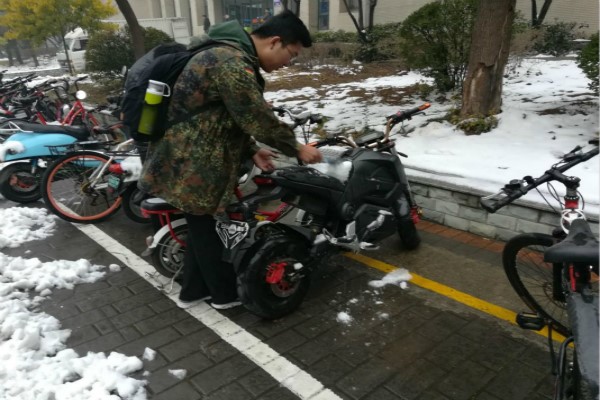 下午2点,活动准时开始。首先,志愿者们来到了南湖运动场附近的单车停放处,志愿者们用提前准备的小铲子、抹布等,清扫单车、电动车以及垃圾箱上面的积雪。随后,沿着马路,志愿者们来到了桃苑2号楼,对宿舍楼旁边单车上的积雪也进行了清理,他们用抹布擦去了车座上的积雪之后,又细心地对车把缝隙间的雪进行了清理。经过清扫,单车焕然一新,志愿者们看着自己的劳动成果,露出了欣慰的笑容。谈到此次志愿活动时,一位学生说道:“寒冬天气,志愿者们工作确实很辛苦,这次活动一方面保护了校园单车,另一方面也方便了学生们的骑行。”